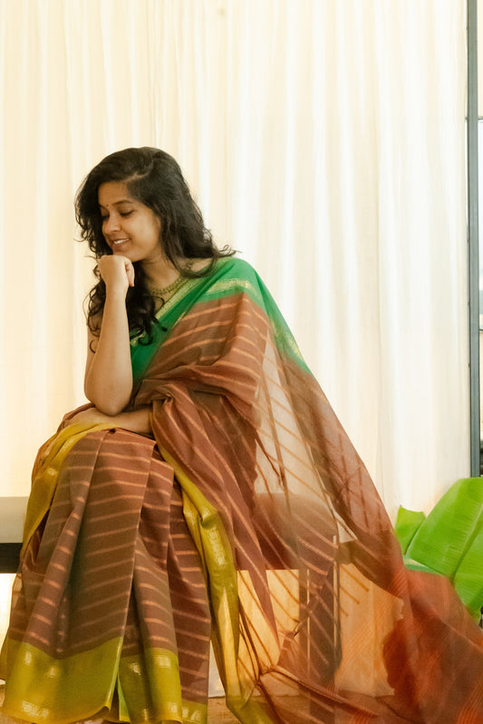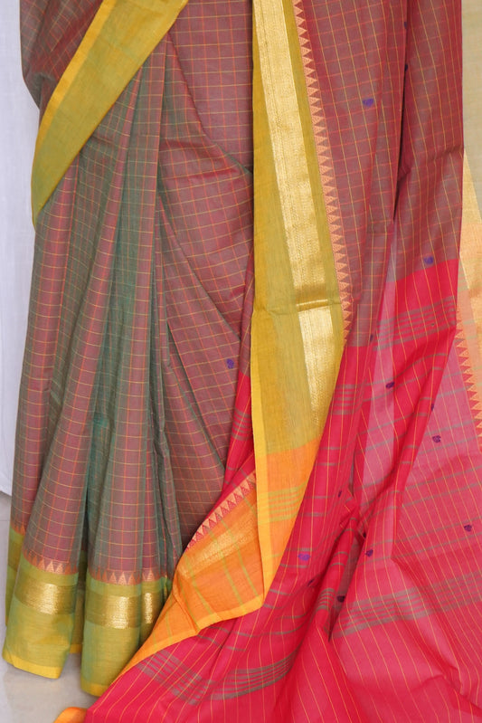 Chettinad Cotton Maroon Green Butti Stripes Saree