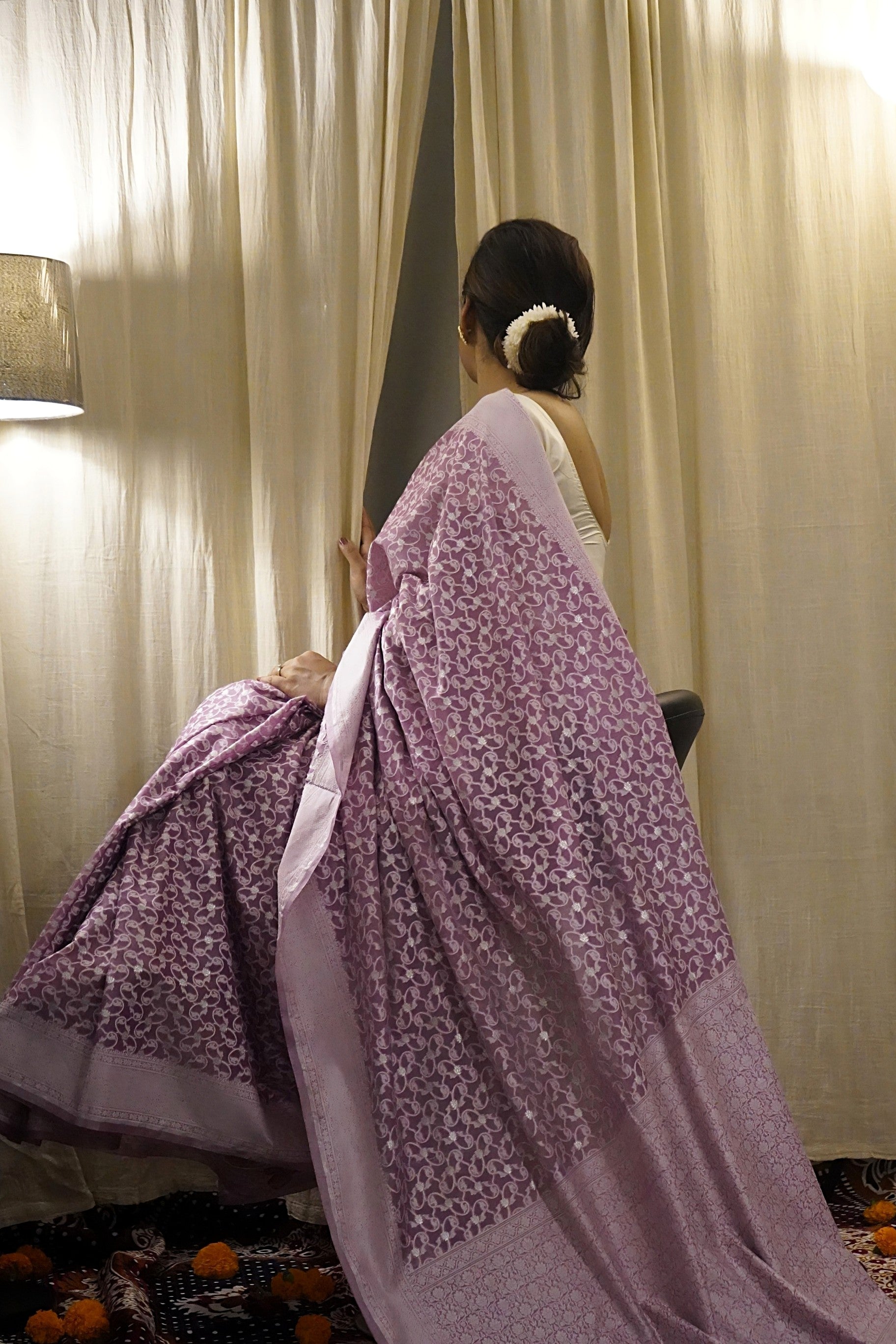 The delicate resham motifs woven across the body create a refined texture and subtle sheen, making this saree ideal for women who prefer elegance without heaviness. Lightweight yet visually rich, it is perfect for festive wear, cultural events, daytime weddings, and graceful everyday occasions.