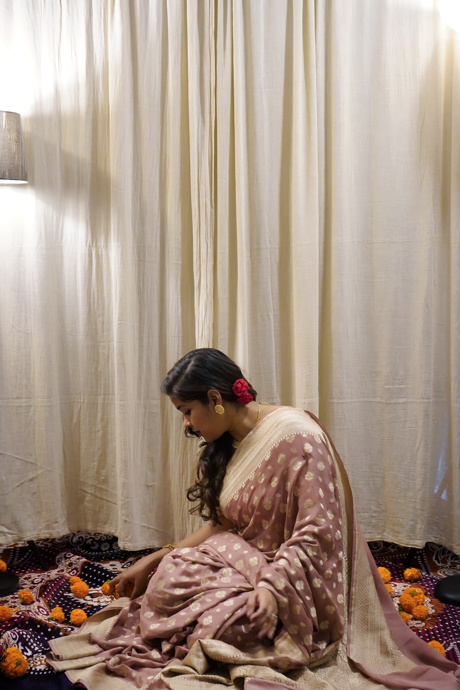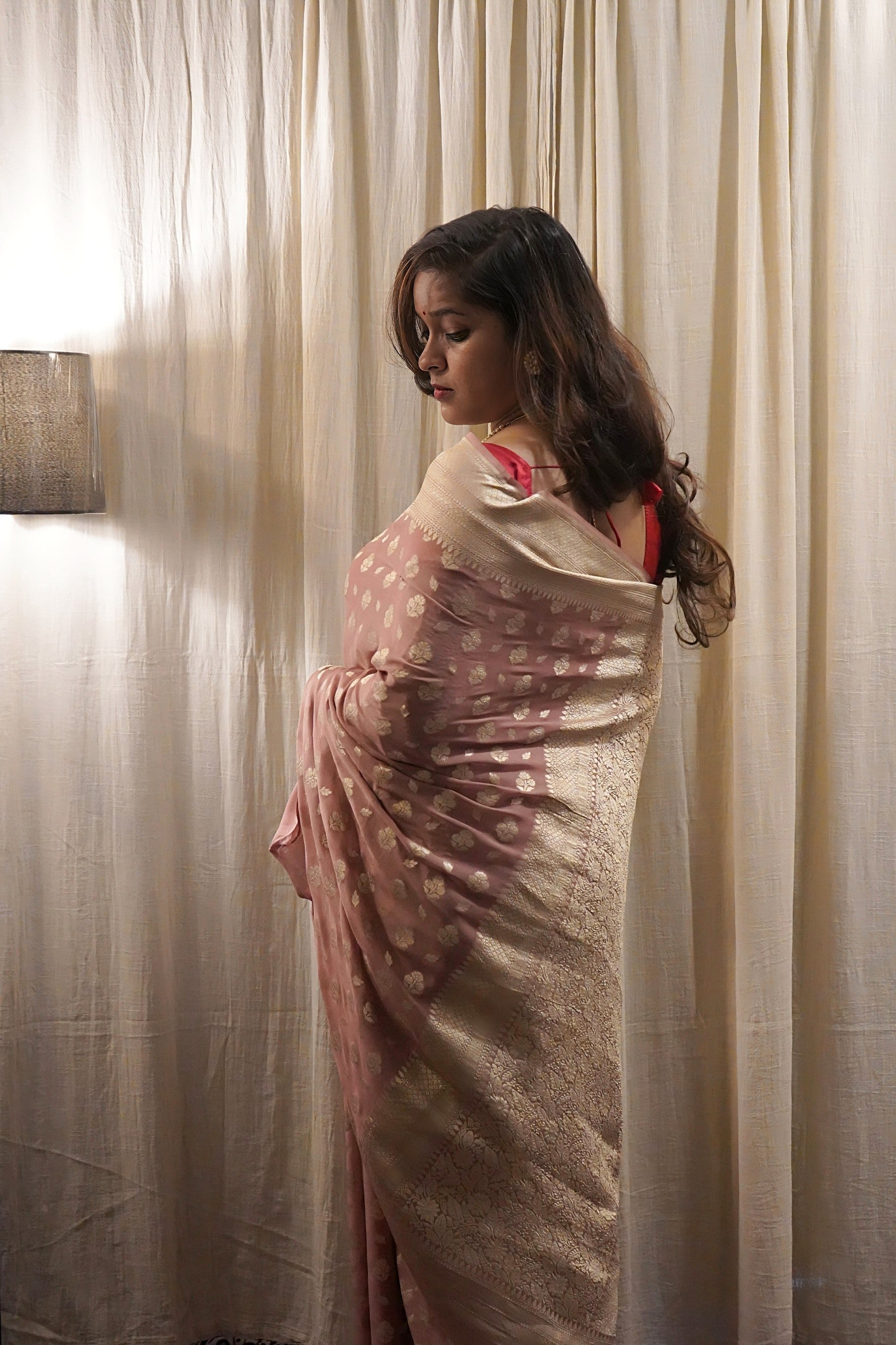 The soft peach-pink hue radiates femininity and elegance, making it perfect for weddings, festive occasions, or evening gatherings. Intricate zari motifs, handwoven by skilled Banarasi artisans, lend it a regal charm without the heaviness of traditional silks.