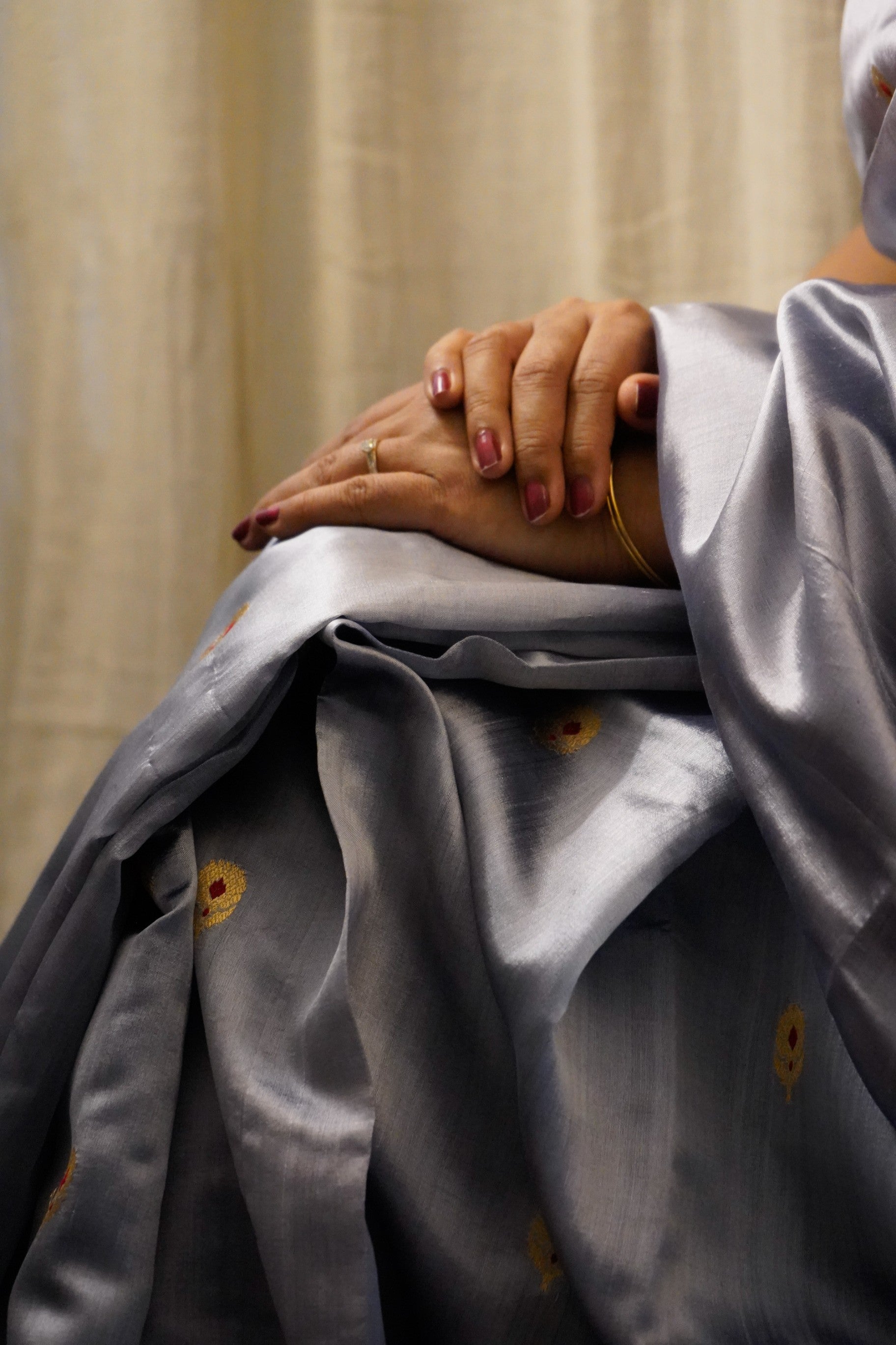 The neutral grey base adds versatility, allowing it to transition effortlessly from day functions to evening occasions. Designed for those who value heritage over trends, this saree is not just worn — it is kept, cherished, and passed on.
