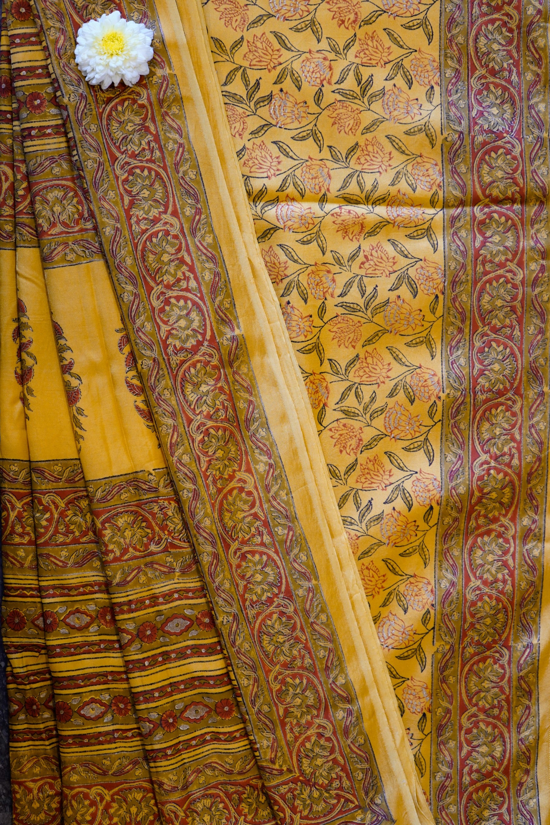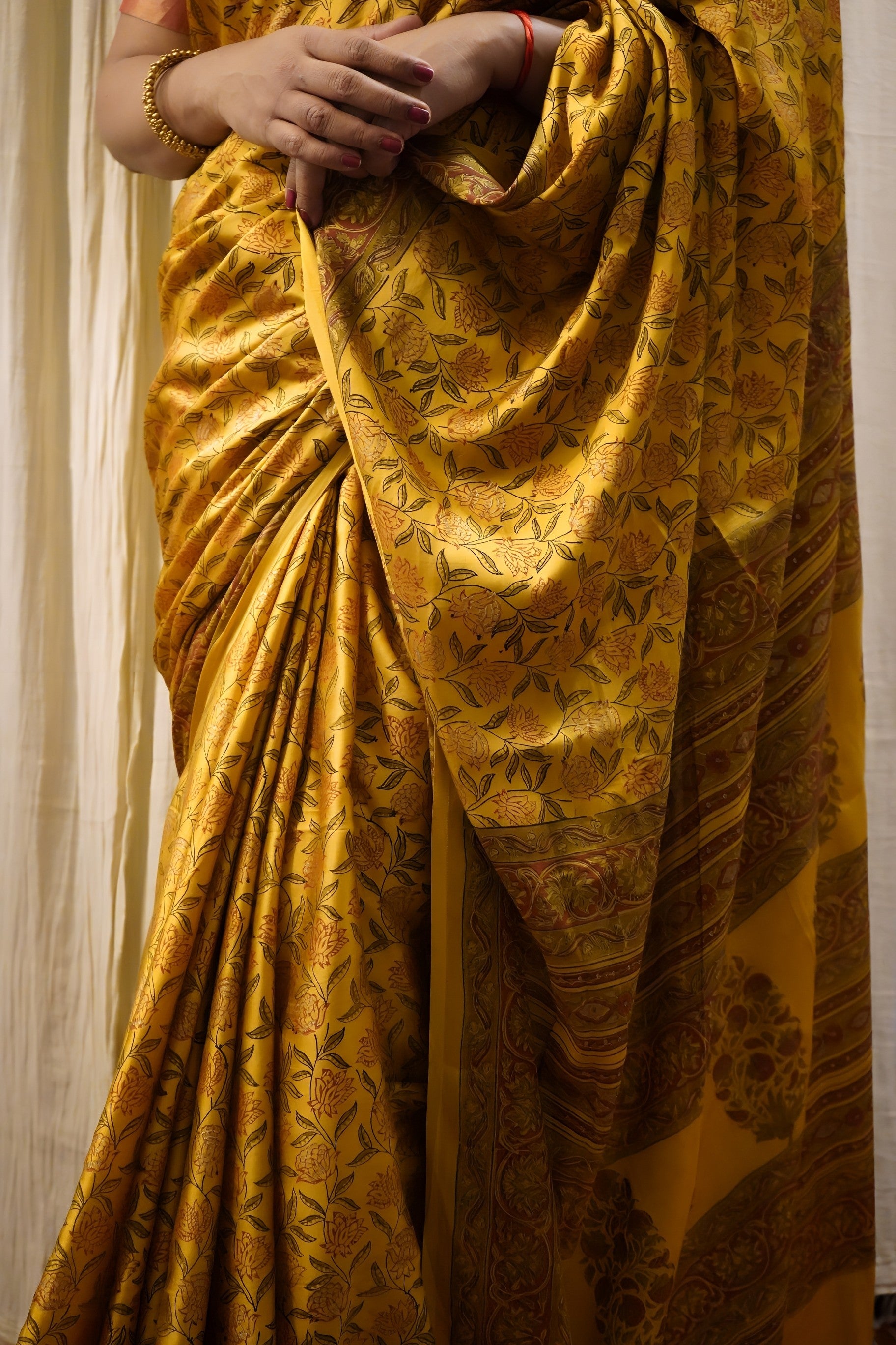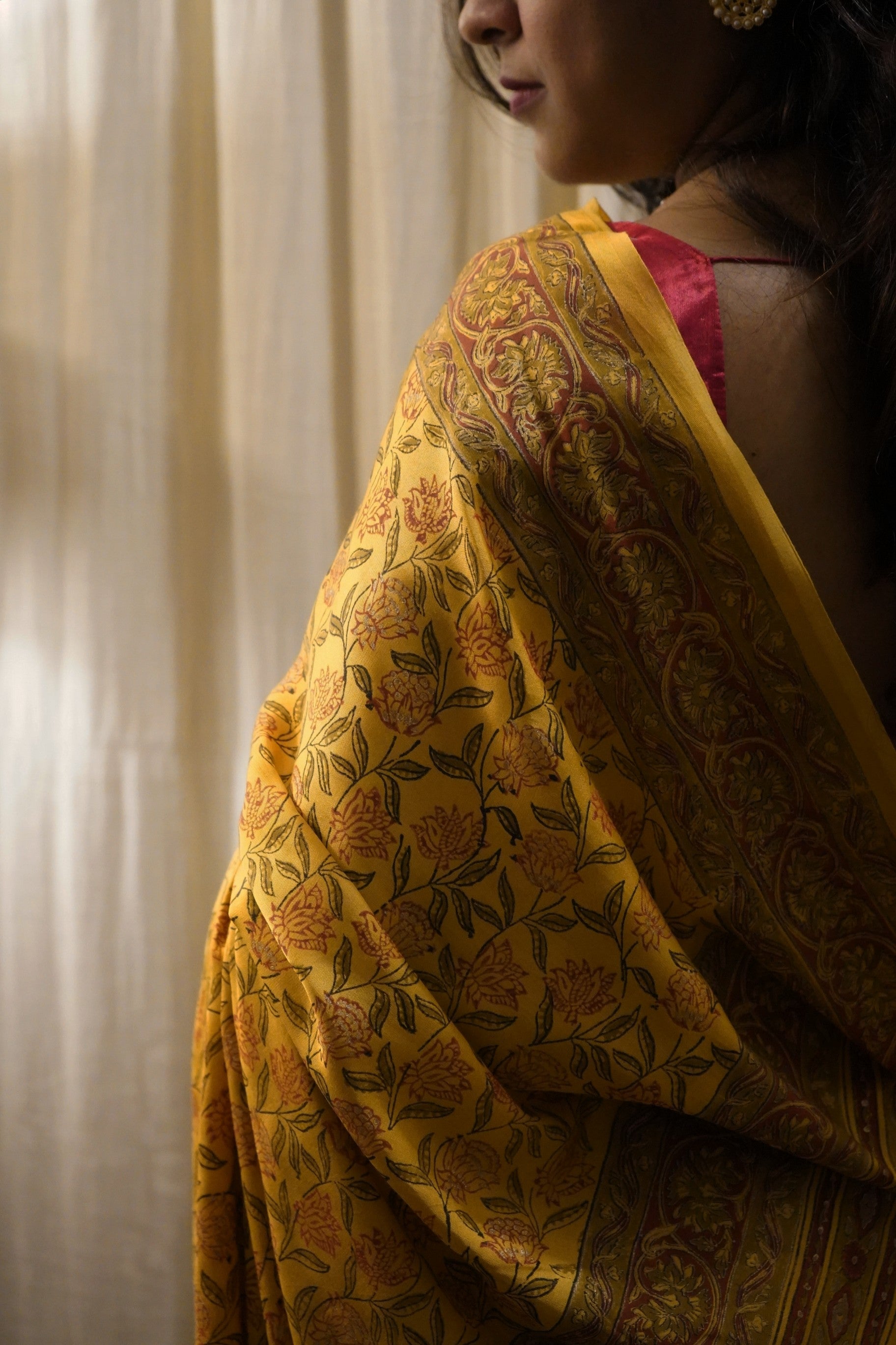 Adorned with traditional handblock prints, crafted by skilled artisans using age-old wooden block techniques, each saree is unique. The natural sheen of Modal silk beautifully enhances the intricate motifs, making it ideal for festive occasions, office gatherings, or casual elegance.